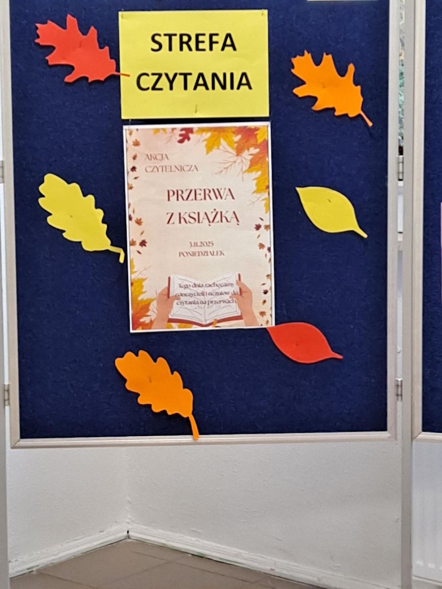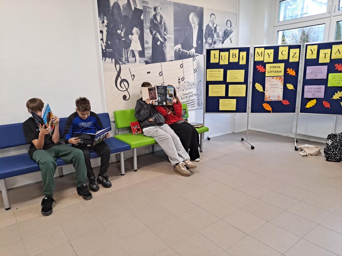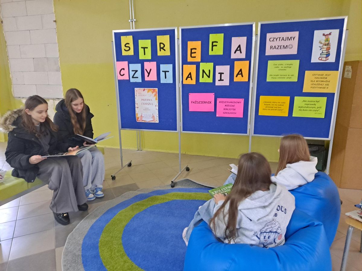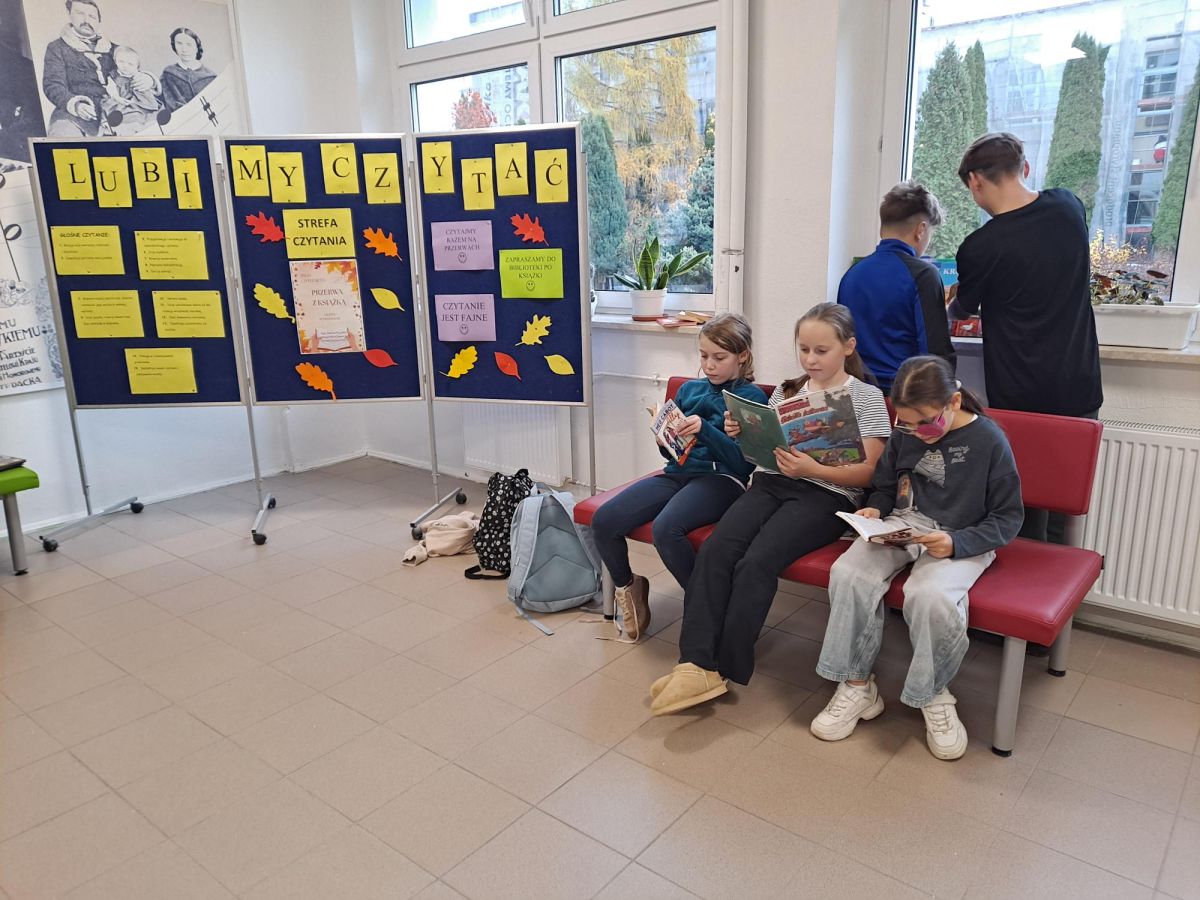 3 listopada 2025 r. w ramach obchodów Międzynarodowego Miesiąca Bibliotek Szkolnych w naszej szkole odbyła się akcja czytelnicza Przerwa z książką. Nauczyciele bibliotekarze przygotowali na korytarzach strefy czytania, w których uczniowie podczas przerw mogli oddać się ulubionej lekturze. Celem akcji była promocja czytelnictwa wśród dzieci i młodzieży, integracja środowiska lokalnego, pokazanie uczniom, że czytanie jest ciekawe oraz zachęcenie uczniów do sięgania po książkę w każdej sytuacji i w każdym miejscu. To był wesoły dzień pełen wrażeń.