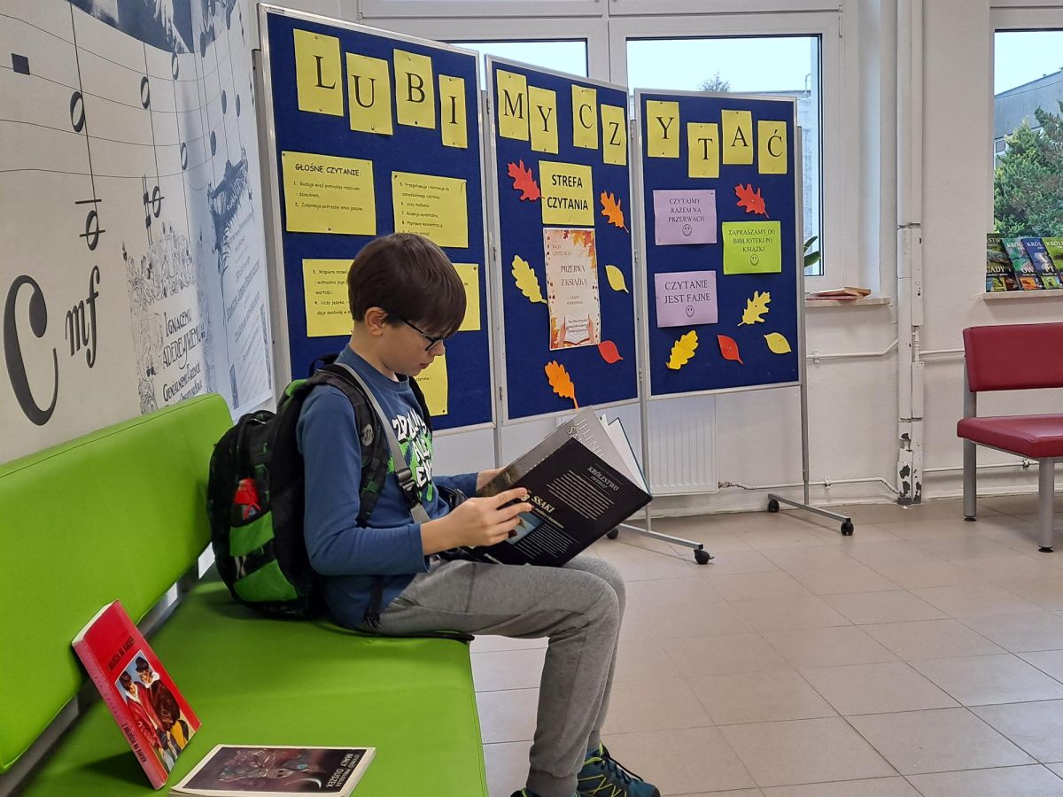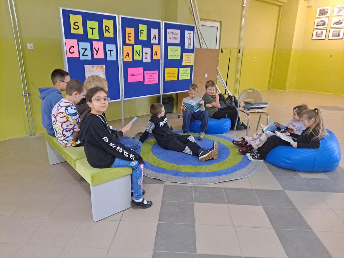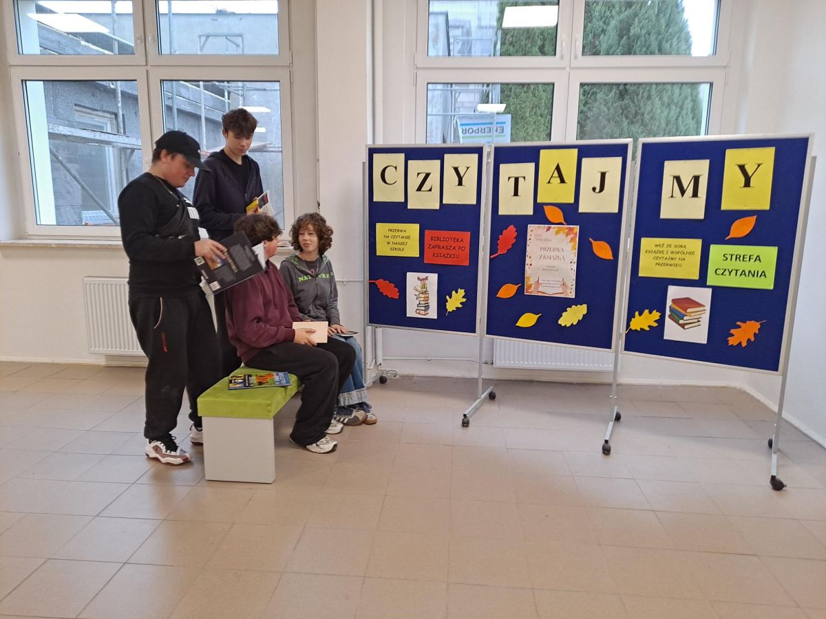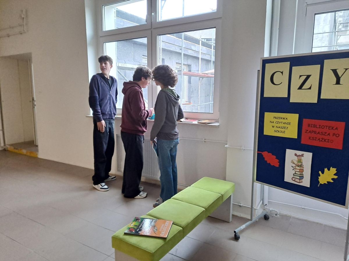 3 listopada 2025 r. w ramach obchodów Międzynarodowego Miesiąca Bibliotek Szkolnych w naszej szkole odbyła się akcja czytelnicza Przerwa z książką. Nauczyciele bibliotekarze przygotowali na korytarzach strefy czytania, w których uczniowie podczas przerw mogli oddać się ulubionej lekturze. Celem akcji była promocja czytelnictwa wśród dzieci i młodzieży, integracja środowiska lokalnego, pokazanie uczniom, że czytanie jest ciekawe oraz zachęcenie uczniów do sięgania po książkę w każdej sytuacji i w każdym miejscu. To był wesoły dzień pełen wrażeń.