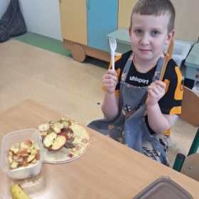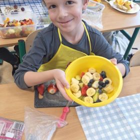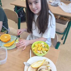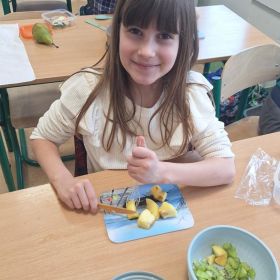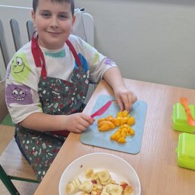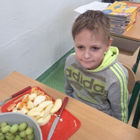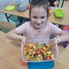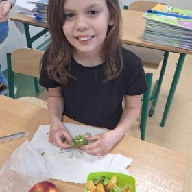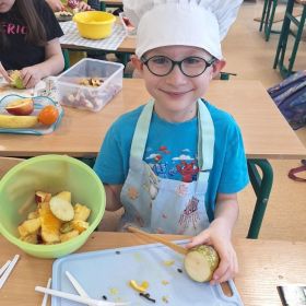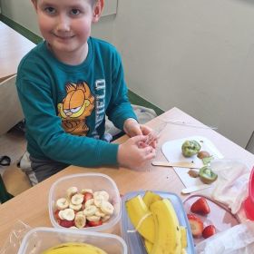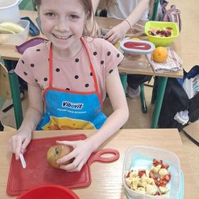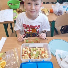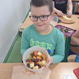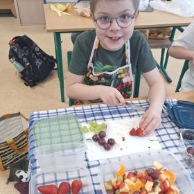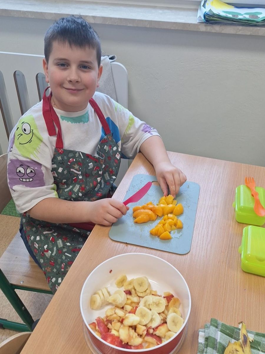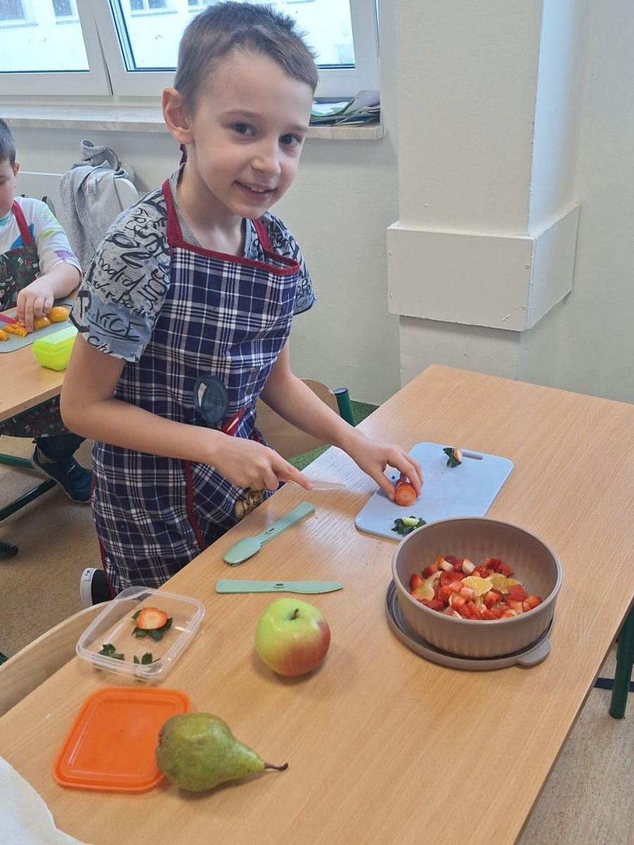 25 lutego 2026 r. uczniowie klasy 2a wzięli udział w praktycznych zajęciach kulinarnych, podczas których przygotowywali pyszną i zdrową sałatkę owocową. Dzieci samodzielnie porcjowały i komponowały owoce, dbając o porządek oraz higienę pracy.