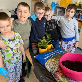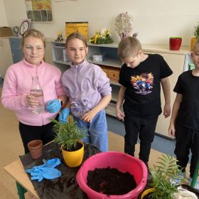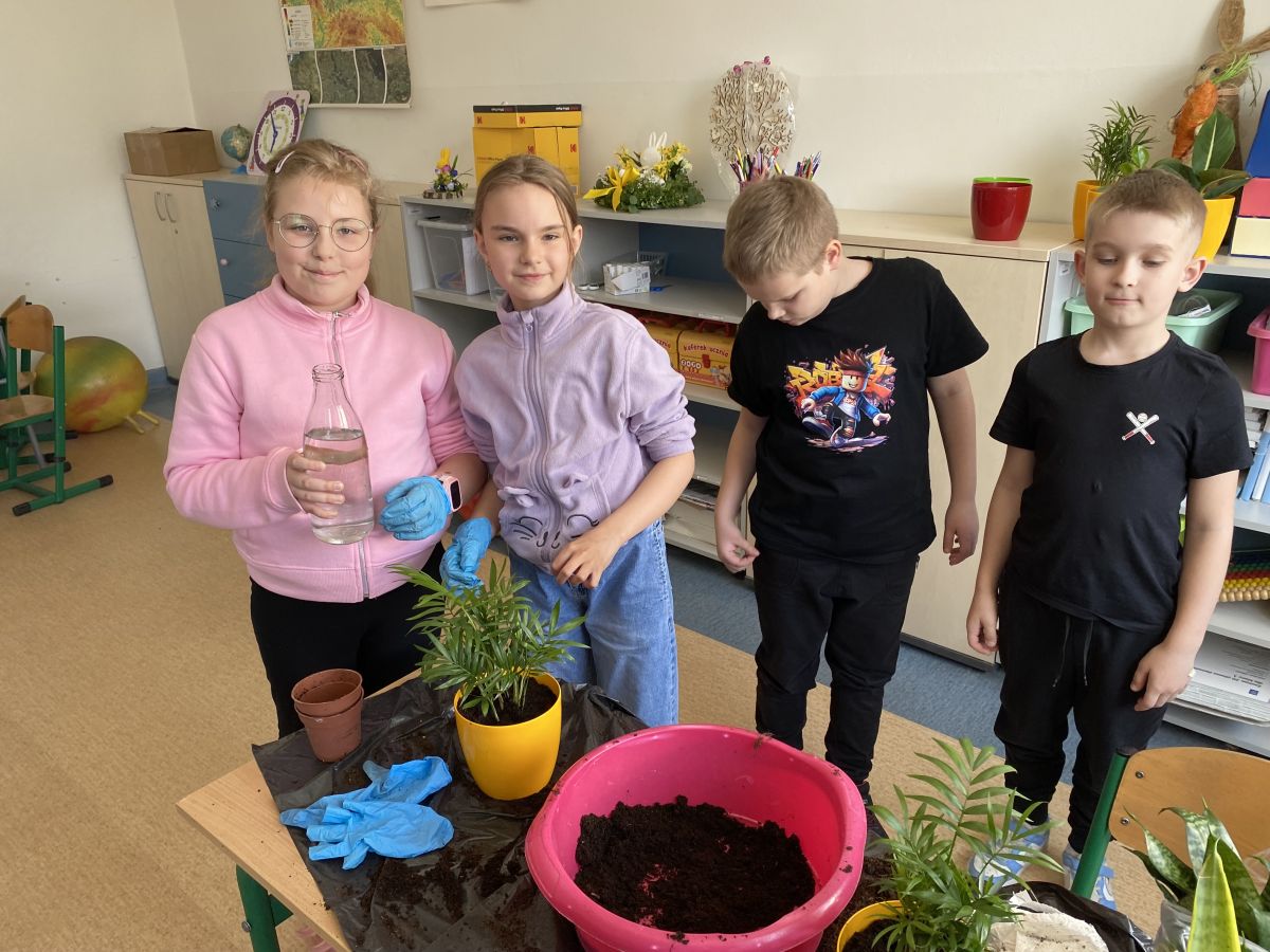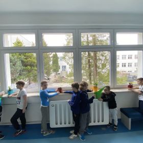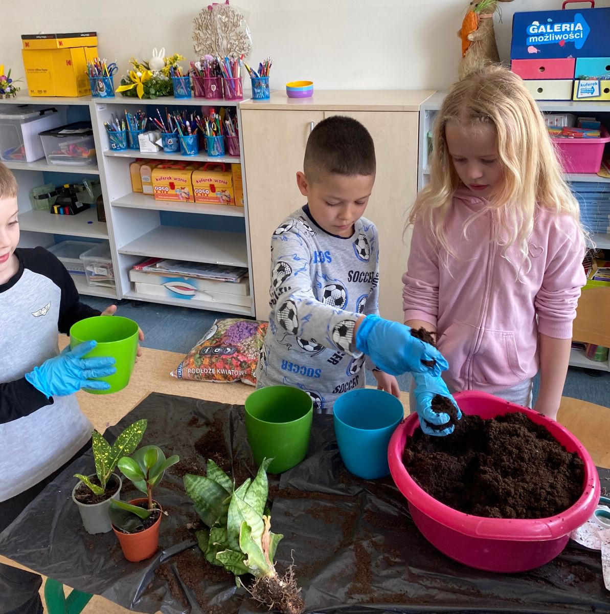 Uczniowie klas I–III wcielili się w rolę małych ogrodników – sadzili rośliny, obserwowali ich rozwój i uczyli się odpowiedzialności za wspólne otoczenie.