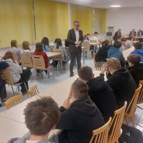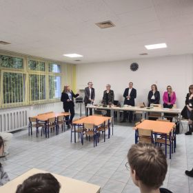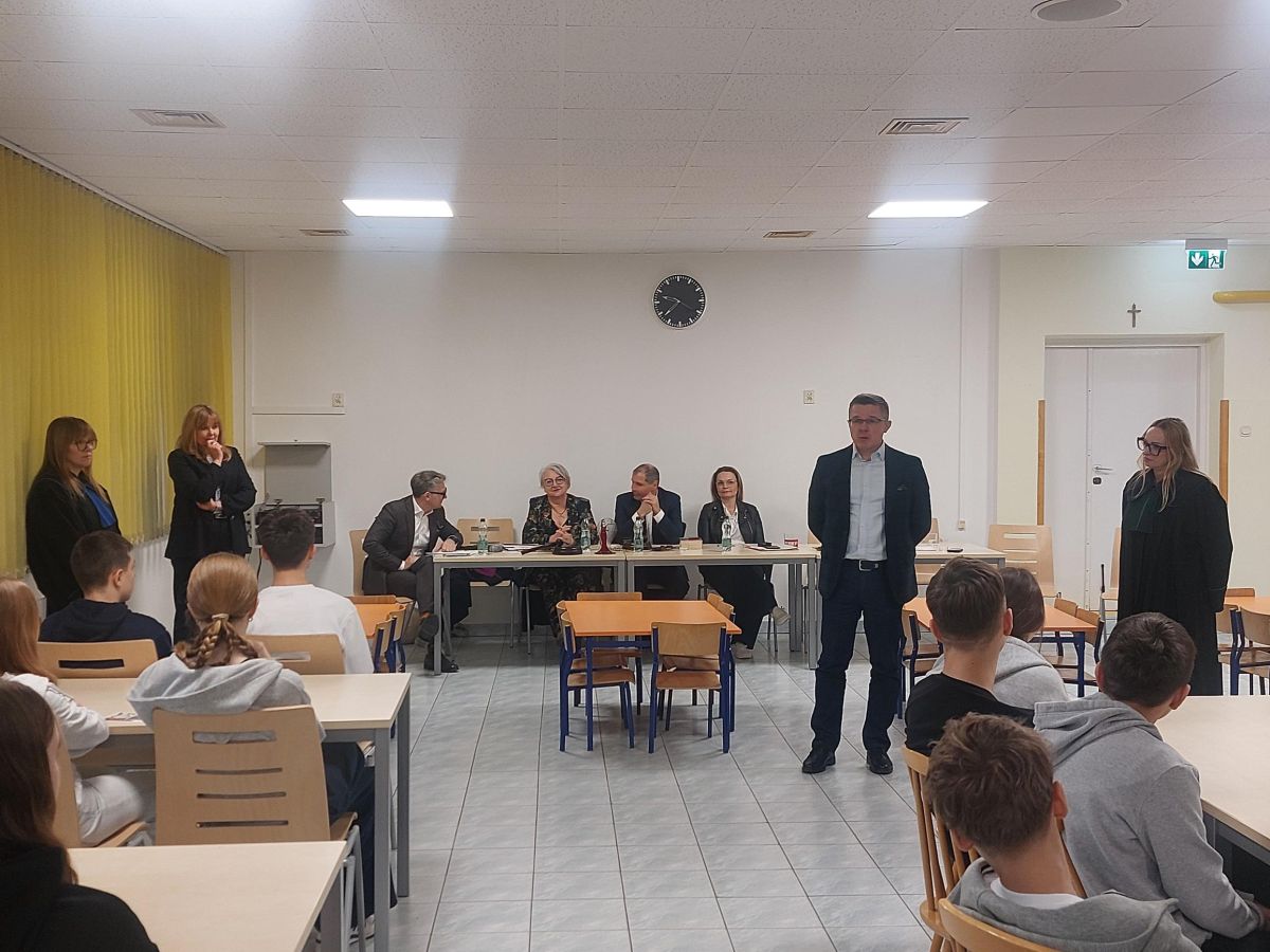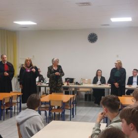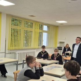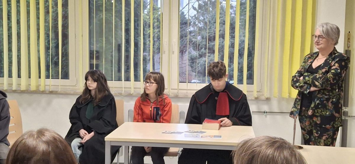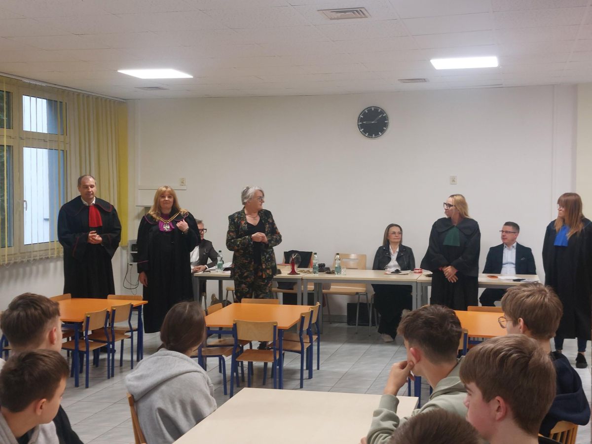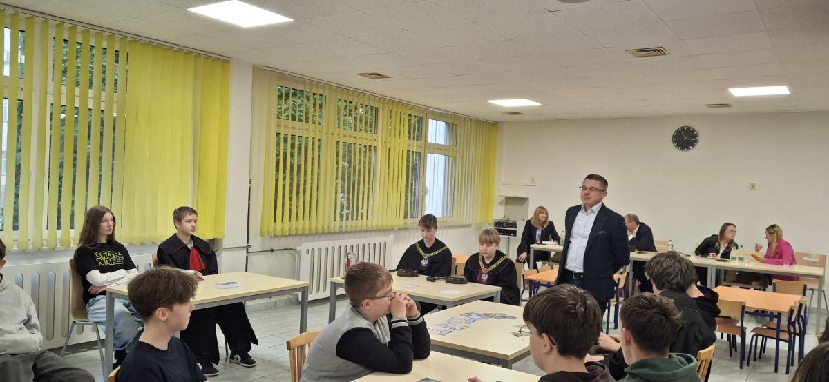 27 marca 2026 r. uczniowie klas VII i VIII wzięli udział w niezwykle interesujących zajęciach poświęconych zawodom prawniczym. Spotkanie poprowadzili przedstawiciele Sądu Okręgowego w Kielcach, którzy przybliżyli młodzieży specyfikę pracy w różnych profesjach związanych z wymiarem sprawiedliwości.