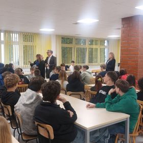 Uczniowie mieli okazję nie tylko wysłuchać ciekawych prezentacji, ale także aktywnie uczestniczyć w krótkich scenkach i zadaniach praktycznych. Dzięki temu mogli lepiej zrozumieć, jak wygląda codzienna praca w poszczególnych zawodach oraz jakie umiejętności są w nich szczególnie istotne.