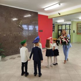 Następnie pani dyrektor Marzena Tranowska dokonała aktu pasowania na uczniów, a pani wicedyrektor Mirosława Skuza wręczyła pierwszakom legitymacje szkolne, oficjalnie przyjmując ich do grona społeczności szkolnej.