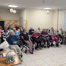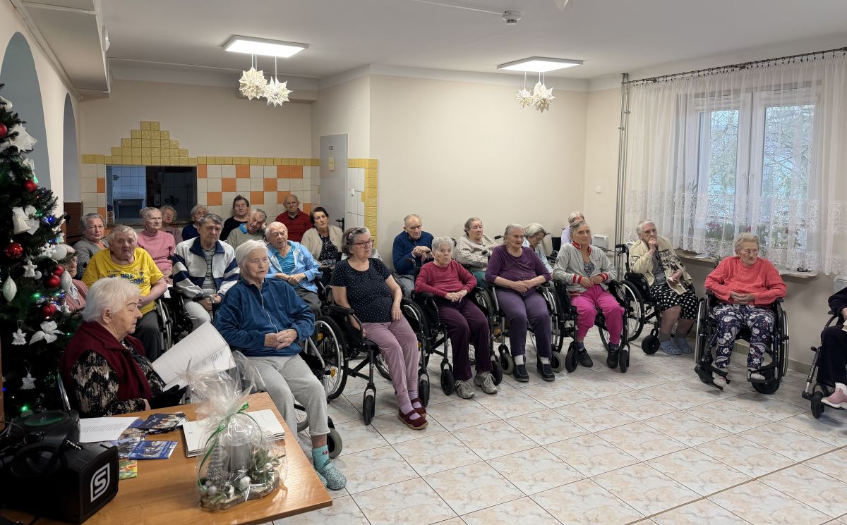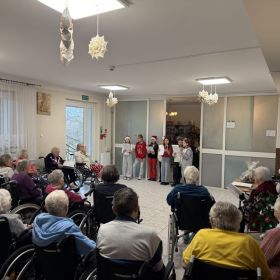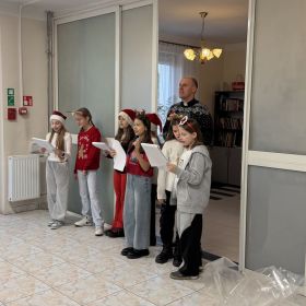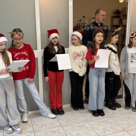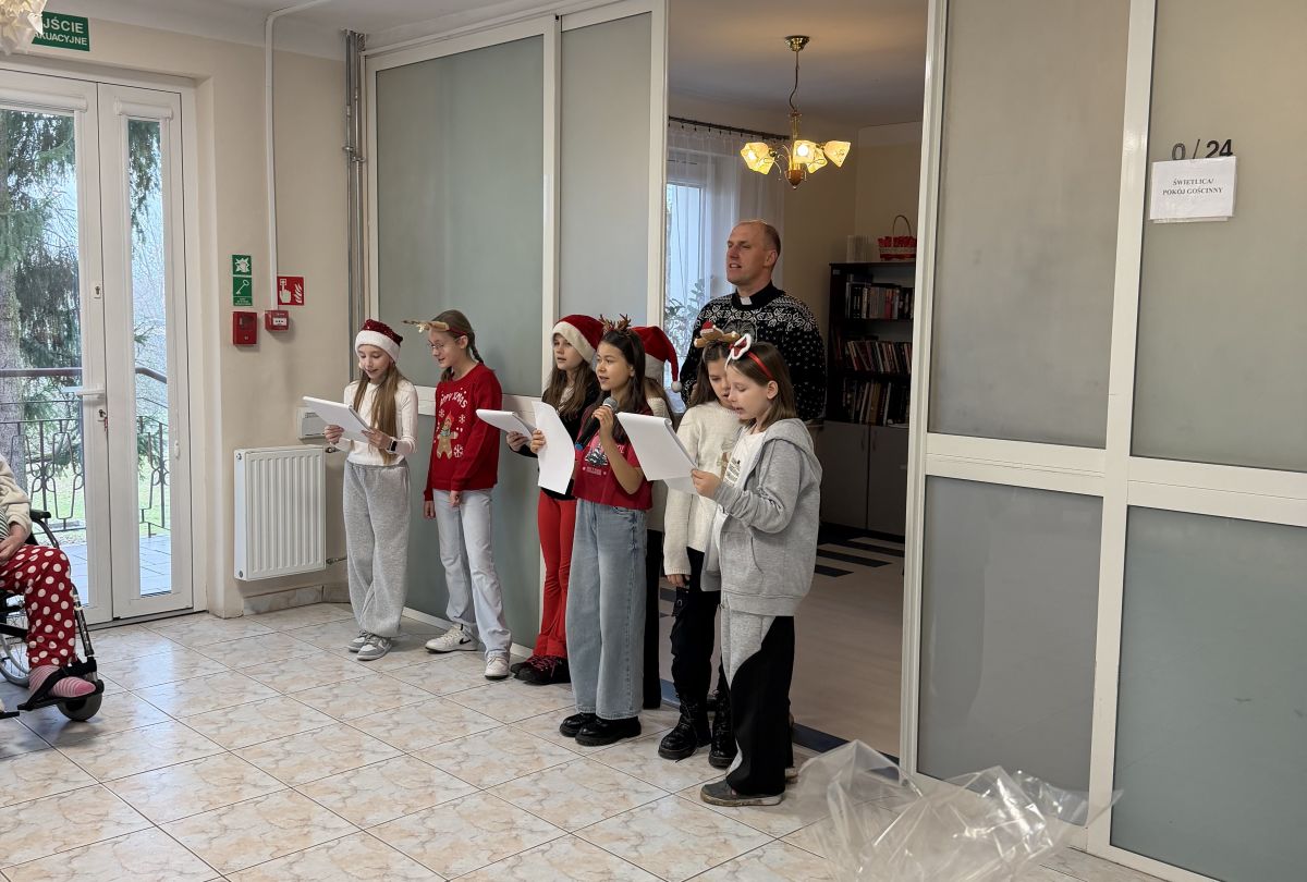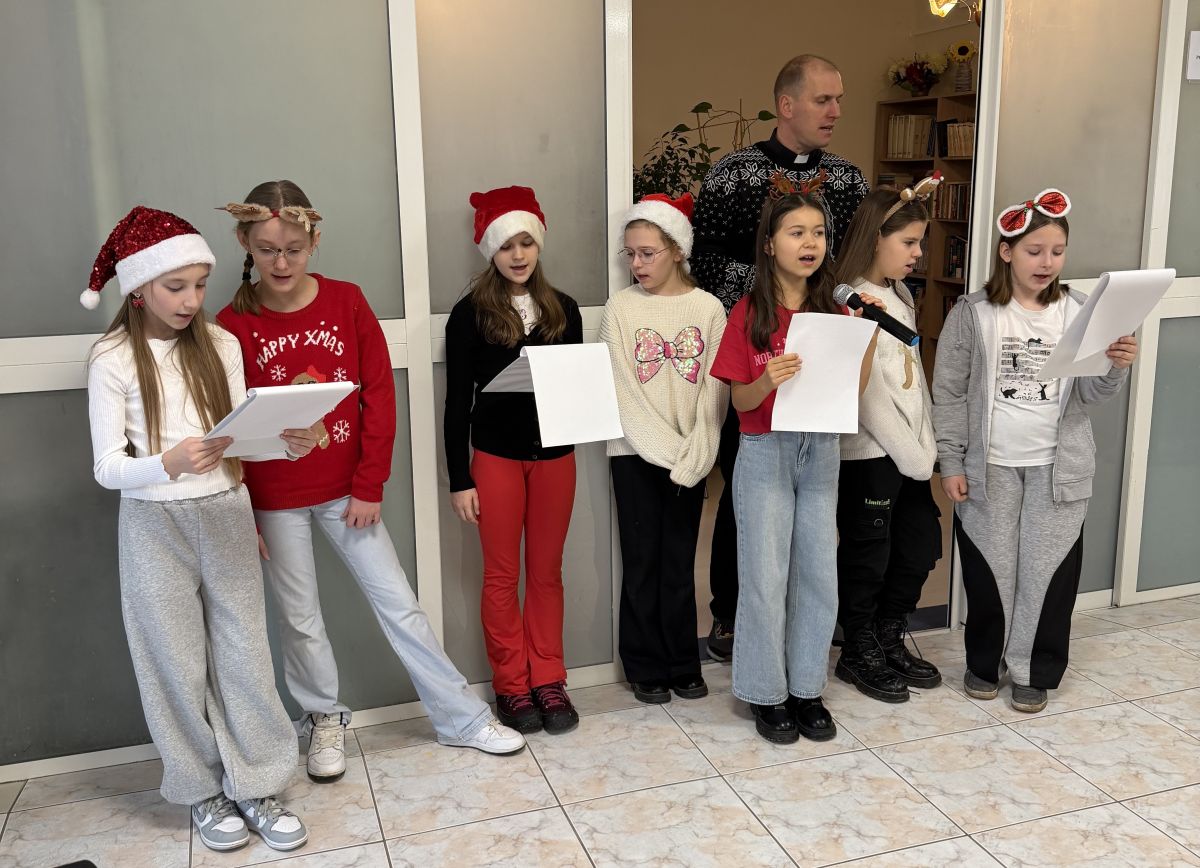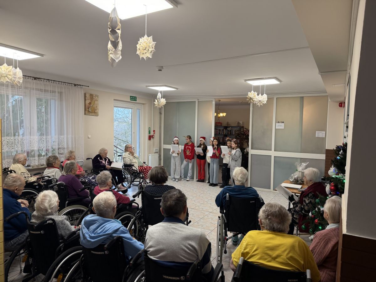 19 grudnia 2025 r. przedstawiciele klasy IV c wraz z ks. Łukaszem odwiedzili Dom Pomocy Społecznej przy ulicy Sobieskiego, aby wspólnie z jego mieszkańcami pokolędować oraz wręczyć im wykonane przez uczniów klas pierwszych i drugich upominki w postaci kartek z życzeniami.