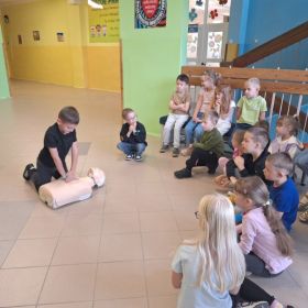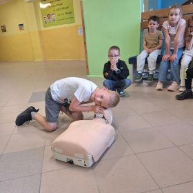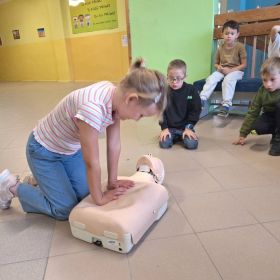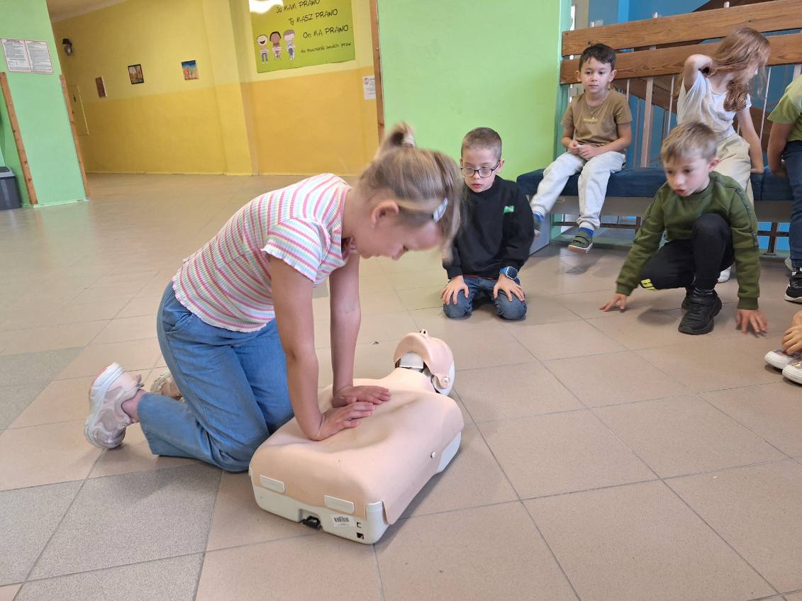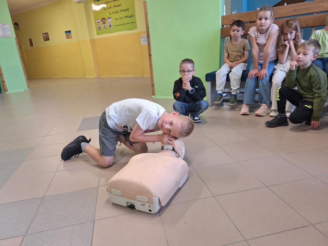 W dniu 17 września 2025 r. uczniowie klasy 1d pod kierunkiem p. B. Haręży wzięli udział w praktycznych zajęciach z zakresu pierwszej pomocy. Podczas spotkania dzieci nauczyły się, jak prawidłowo ułożyć osobę poszkodowaną w pozycji bocznej bezpiecznej oraz ćwiczyły wykonywanie ucisków na fantomach. Uczniowie utrwalili znajomość numerów alarmowych oraz dowiedzieli się, jak należy postępować w sytuacji, gdy zauważą osobę potrzebującą pomocy. Omówiono również sposób skutecznego i bezpiecznego wezwania pomocy.